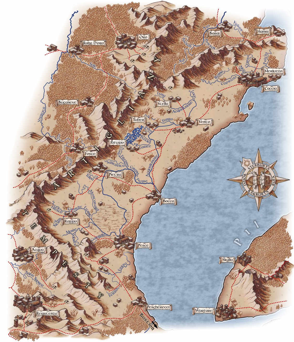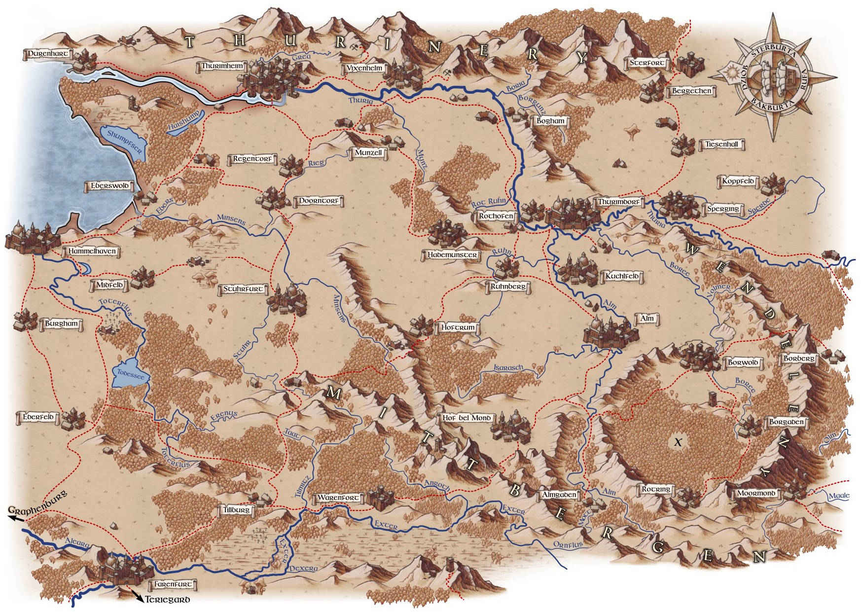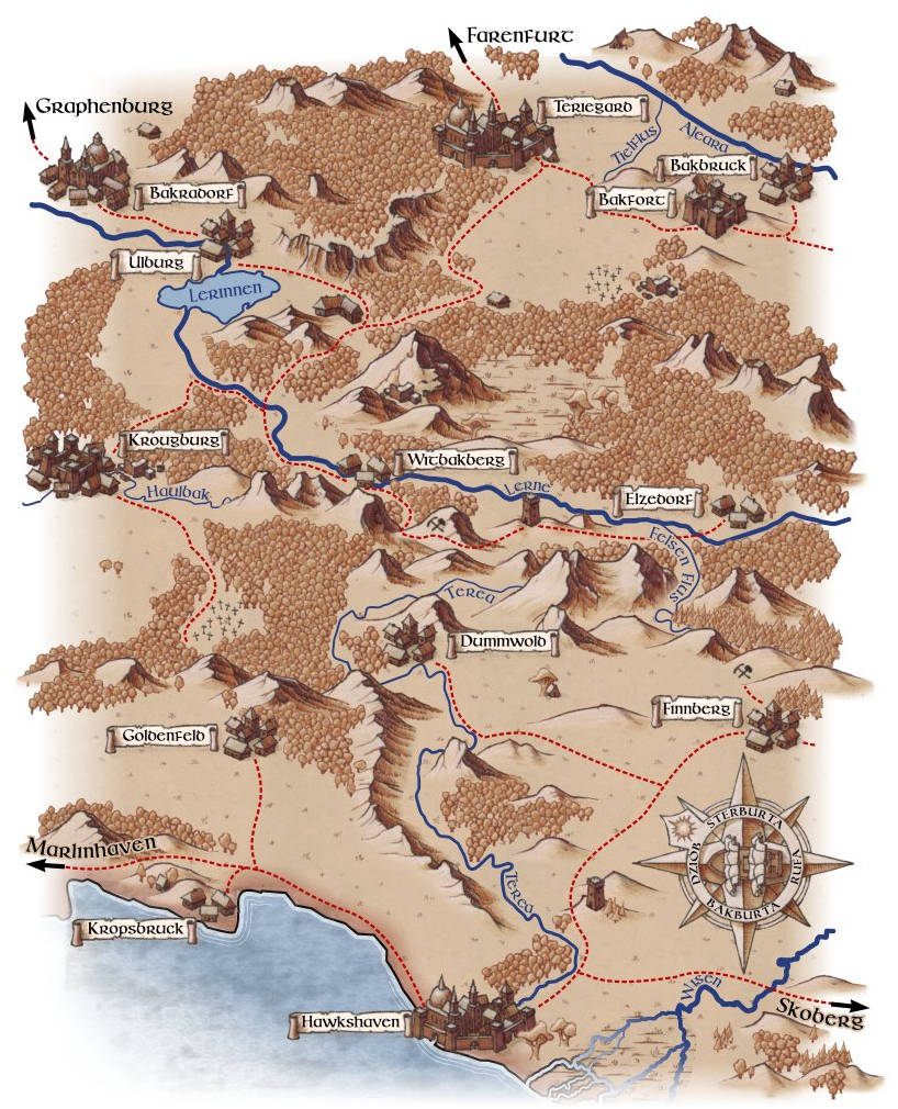 Wszystko zaczęło się od warsztatów tworzenia map, prowadzonych przez Michała Oracza podczas któregoś z konwentów RPG. Mógł to być 2003 albo 2004 rok. Mapa, która wówczas powstała, stała się inspiracją do stworzenia projektu mapy dla naszego nowo powstałego świata. Wszystkie obiekty (góry, miasta, rzeki itd.) były wektorowe, a powstały w 2007 roku w programie InkScape. Gdy projekt mocno się rozrósł, działanie programu stawało się tak powolne, że musieliśmy rozbić jeden wspólny plik na cztery kawałki. Z czasem i to okazało się niewystarczające. W 2011 Przenieśliśmy się z naszymi wektorami do programu Xara/Magix Photo&Graphic Designer. W 2018 roku namalowaliśmy wszystkie obiekty od nowa, porzucając wektory na rzecz rastrów.