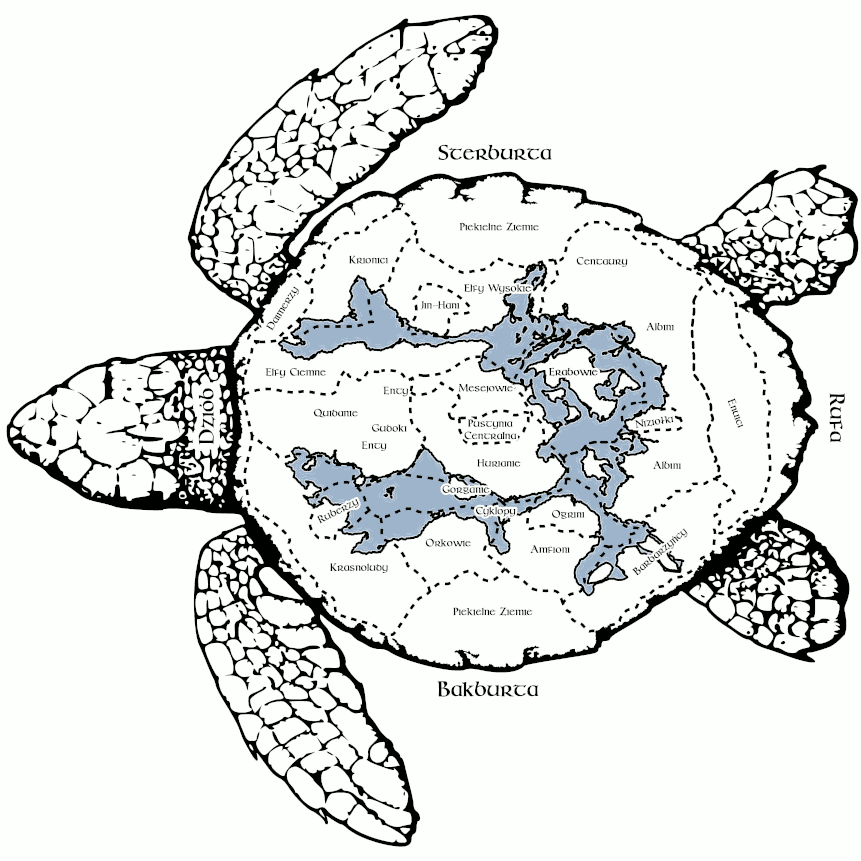 Nasz świat to gigantyczny żółw, mknący przez kosmos ku gwiazdom. Na jego skorupie wznoszą się górskie pasma, roztaczają się rozległe równiny, falują morza i oceany, rozciągają się pustynie rozżarzone gorącym słońcem i te lodowe - skute lodem i zasypane śniegiem. Prócz zwykłych lasów ziemię porastają wielkie drzewa wysokie na kilometr, tworzące zielone krainy ze swych koron, a także olbrzymie grzyby - tak duże, że można w nich zrobić dom. Skorupę wielkiego żółwia pokrywa sieć dróg, łącząca osady, wsie i miasta kilunastu cywilizacji. Taki świat wymaga mapy, to chyba oczywiste...